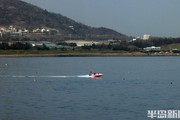 4月12日的我国南海晴空万里。两艘小型无人船被港口的一中型船只载着驶入茫茫大洋布放...